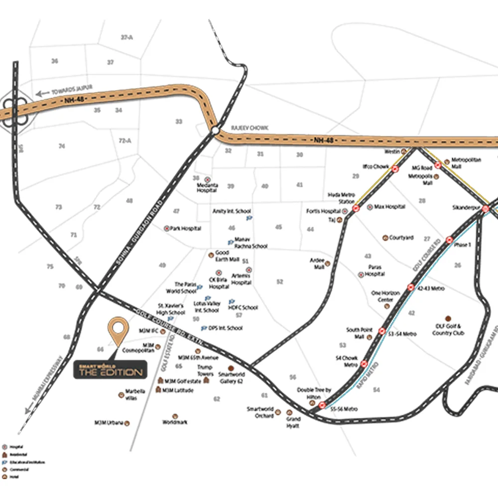 Smart World The Edition Sector 66 surrounded by corporate hubs, premium residences, schools, colleges, malls, hospitals and other essential facilities. If you are looking for luxury and convenience in one of Gurgaon fastest growing areas, Smart World The Edition gives you an unparalleled living experience with world class amenities and connectivity to all key locations.